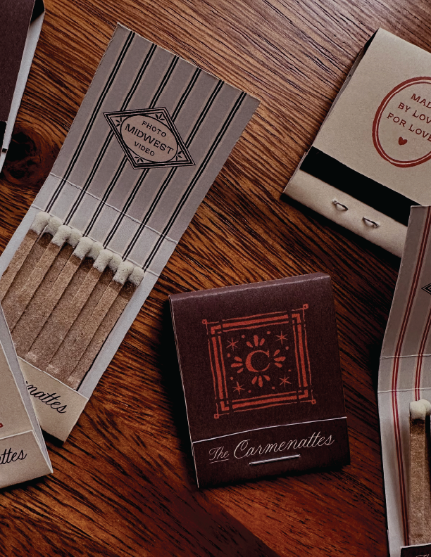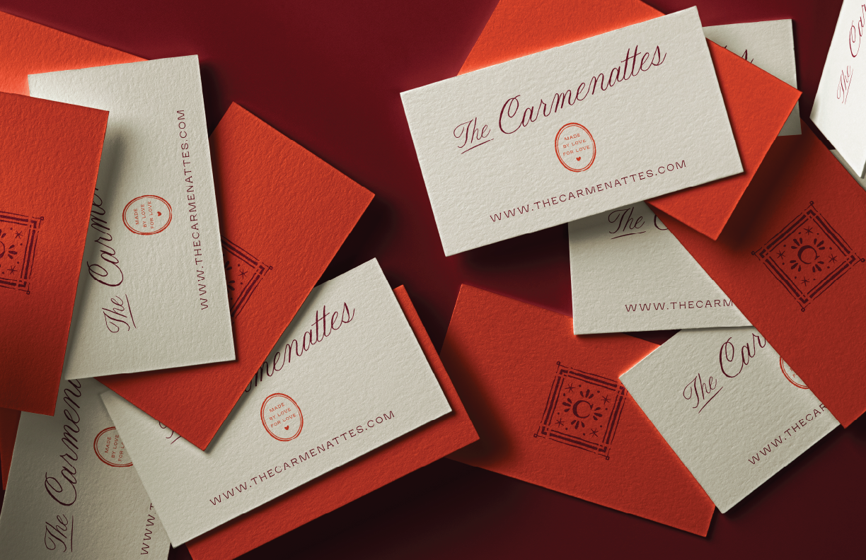 For The Carmenattes, a photography duo capturing weddings, milestones, and portraits, Noodlebird developed a brand identity that balances nostalgia, romance, and charm. A whimsical handwritten script serves as the main wordmark. The mark, inspired by a traditional bookplate, nods to the storytelling at the heart of their work. The peony in its bud stage represents beginnings and new chapters in life – often the moments they're invited to capture.